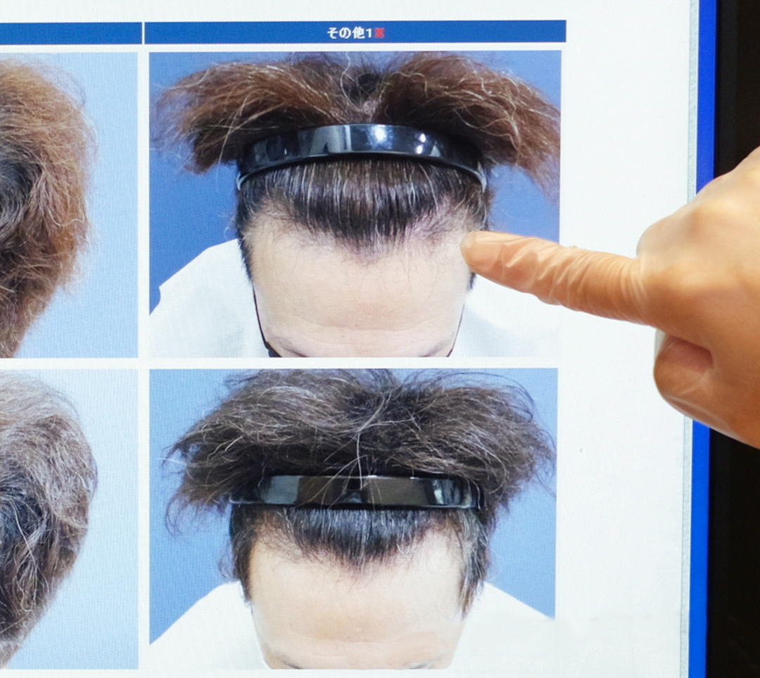 経過は非常に順調とのこと! 今も新しい産毛がたくさん生えてきており、前回1cmほどだった産毛が2cmほどの長さに伸びていました。特に生え際(M字の両端)は良い変化が。毛穴から産毛が2〜3本生えるなど髪の本数が増えて、伸びる過程でハリやコシのある太い髪に成長しているようです! 頭部写真を見てもM字の隙間が徐々に埋まってきていることが目視でき、このまま順調にいけば生え際のラインがきれいに整いそうな予感…!